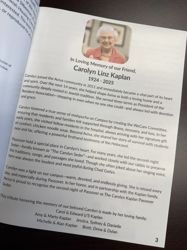 This year, our seders were filled with both sadness and deep gratitude, as we mourned the loss of a truly incredible resident, Carolyn Linz Kaplan z”l.