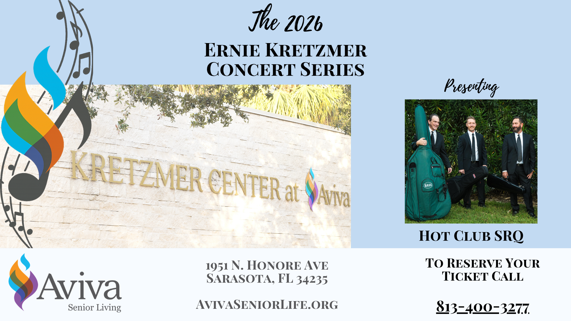 Aviva presents Hot Club SRQ Hot Club SRQ is one of the Southeast’s premier Gypsy Jazz ensembles, praised as “swinging, versatile, and refined.” Inspired by Django Reinhardt and Stéphane Grappelli, the trio blends Jazz Manouche and acoustic string swing with irresistible energy and charm. Led by Keven Aland (violin/vocals) with Jon McLaughlin (guitar) and Glenn Stevenson […]